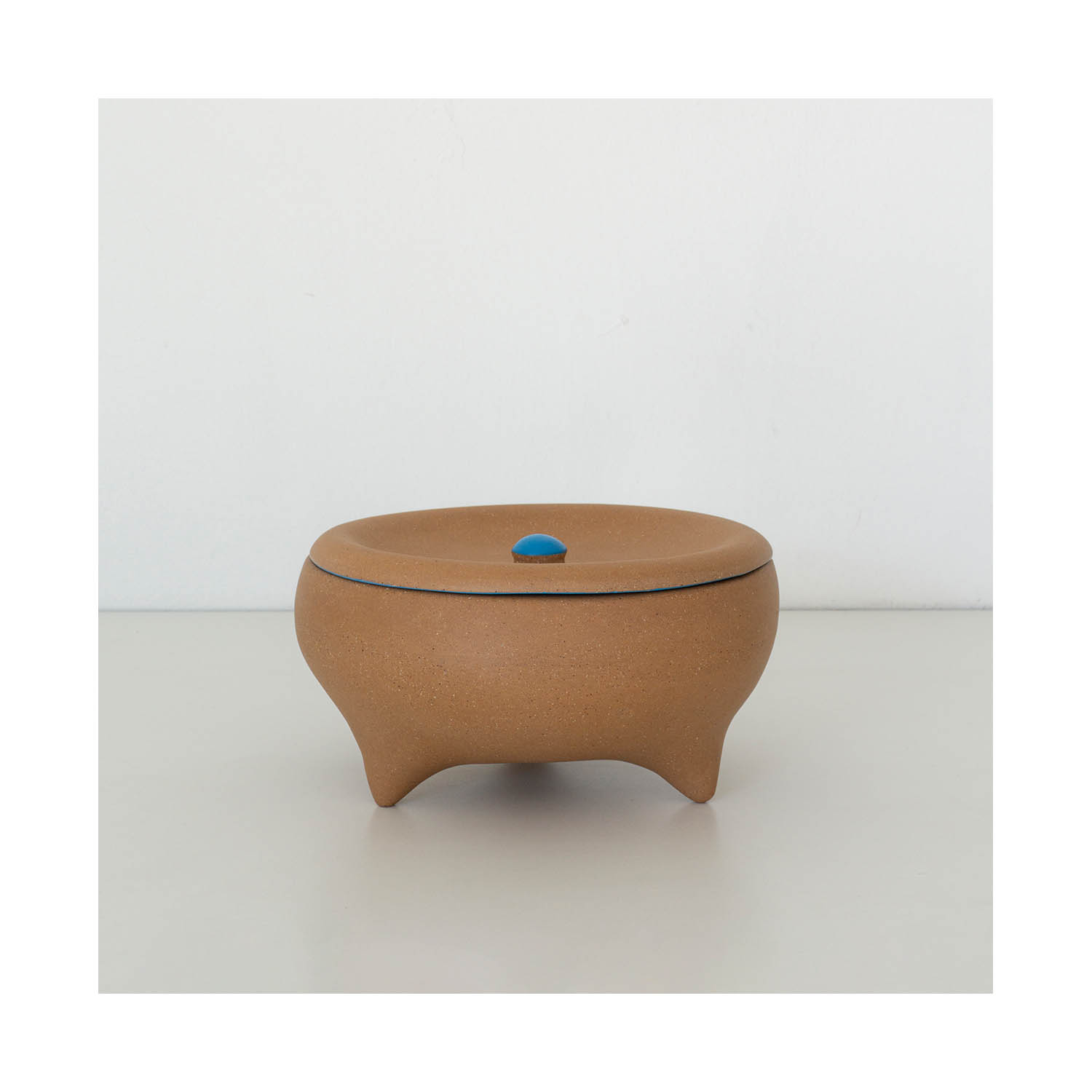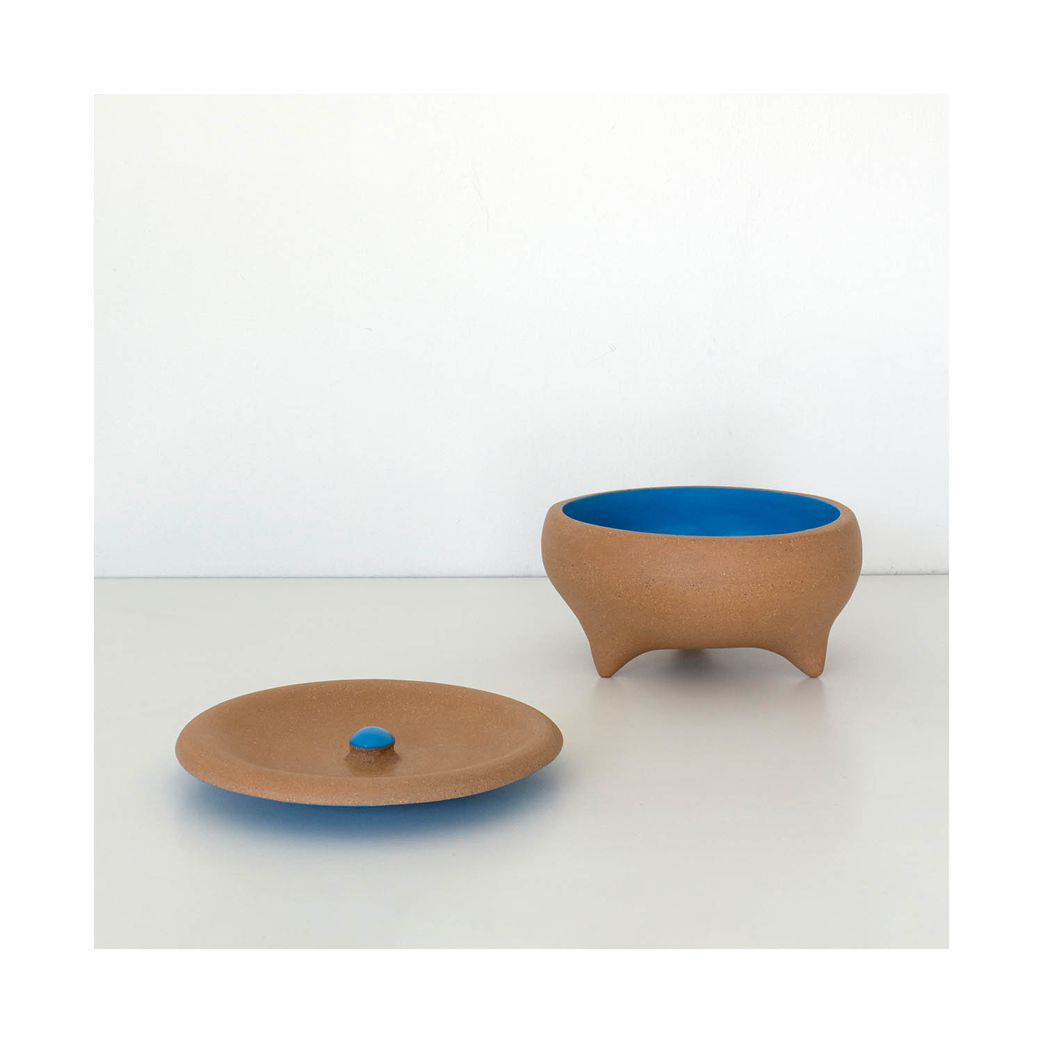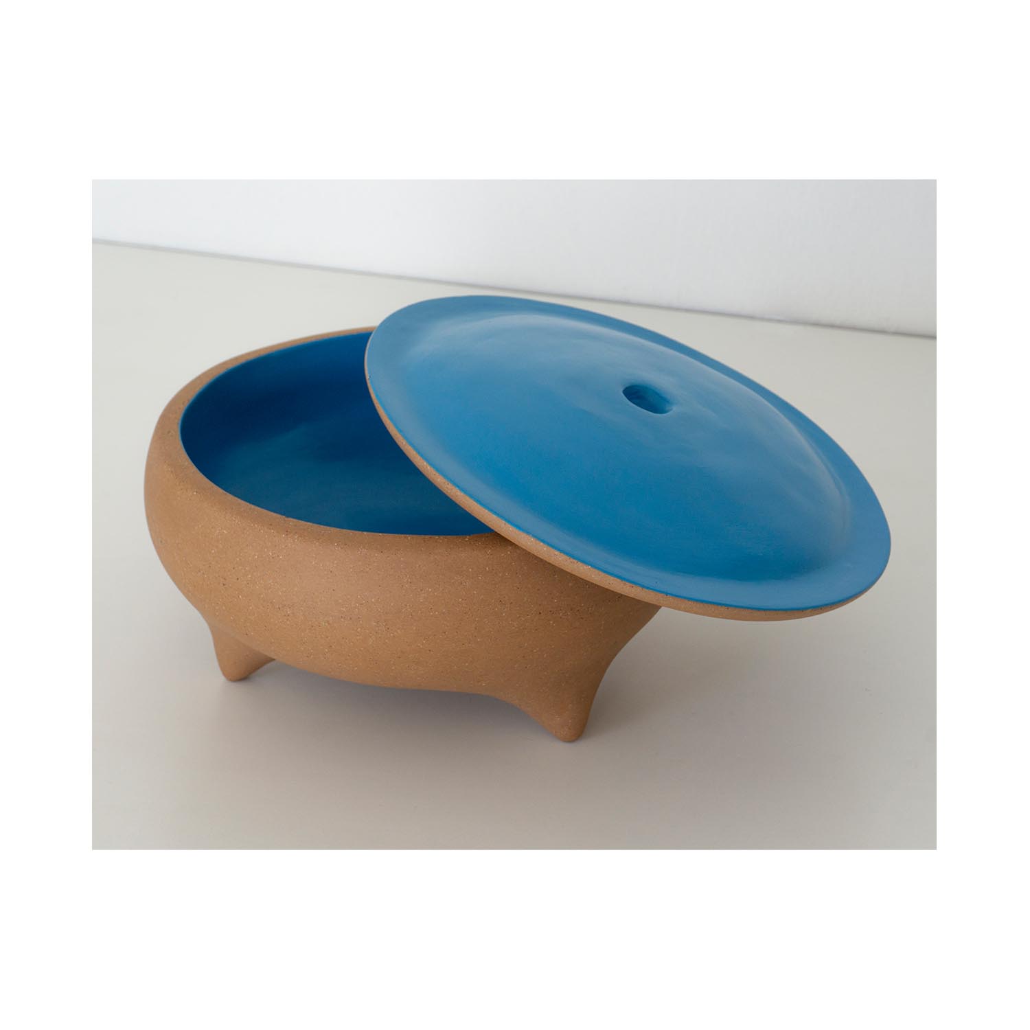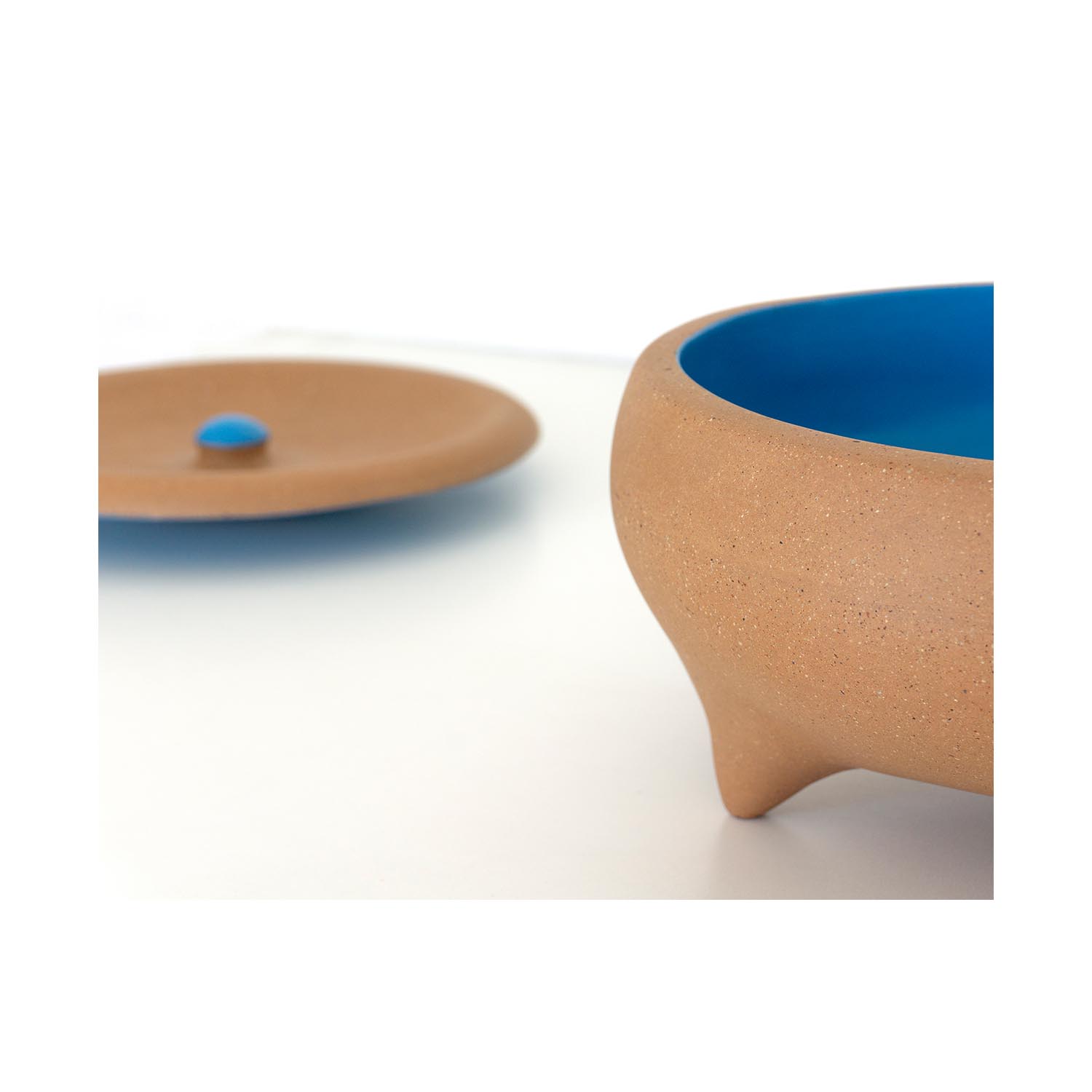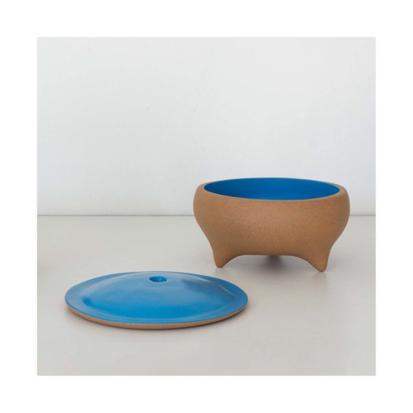 Tazón de barro con tapa incluida elaborado completamente a mano. Puede utilizarse para contener tortillas, pan, frutas, verduras, huevos, o como sencilla pieza decorativa que destaca en cualquier cocina o comedor gracias al color brillante de su interior y su agarradera, detalles que contrasta con el acabado suave y natural del resto de la pieza. Tiene un proceso de sellado.